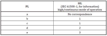 控制系統(tǒng)安全相關部件在預期條件下執(zhí)行安全功能的能力分為5級,稱之為性能等級(PL)。這些性能等級由每小時發(fā)生危險失效的概率來定義。